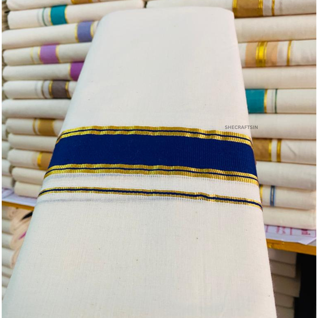 KERALA HANDLOOM DHOTHI | BALARAMAPURAM DHOTHI | BLUE AND GOLDEN BORDER | IVORY | COTTON KASAVU MUNDU