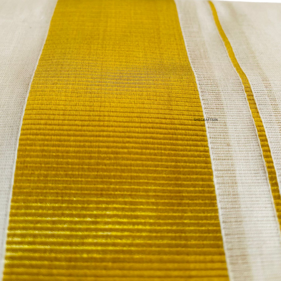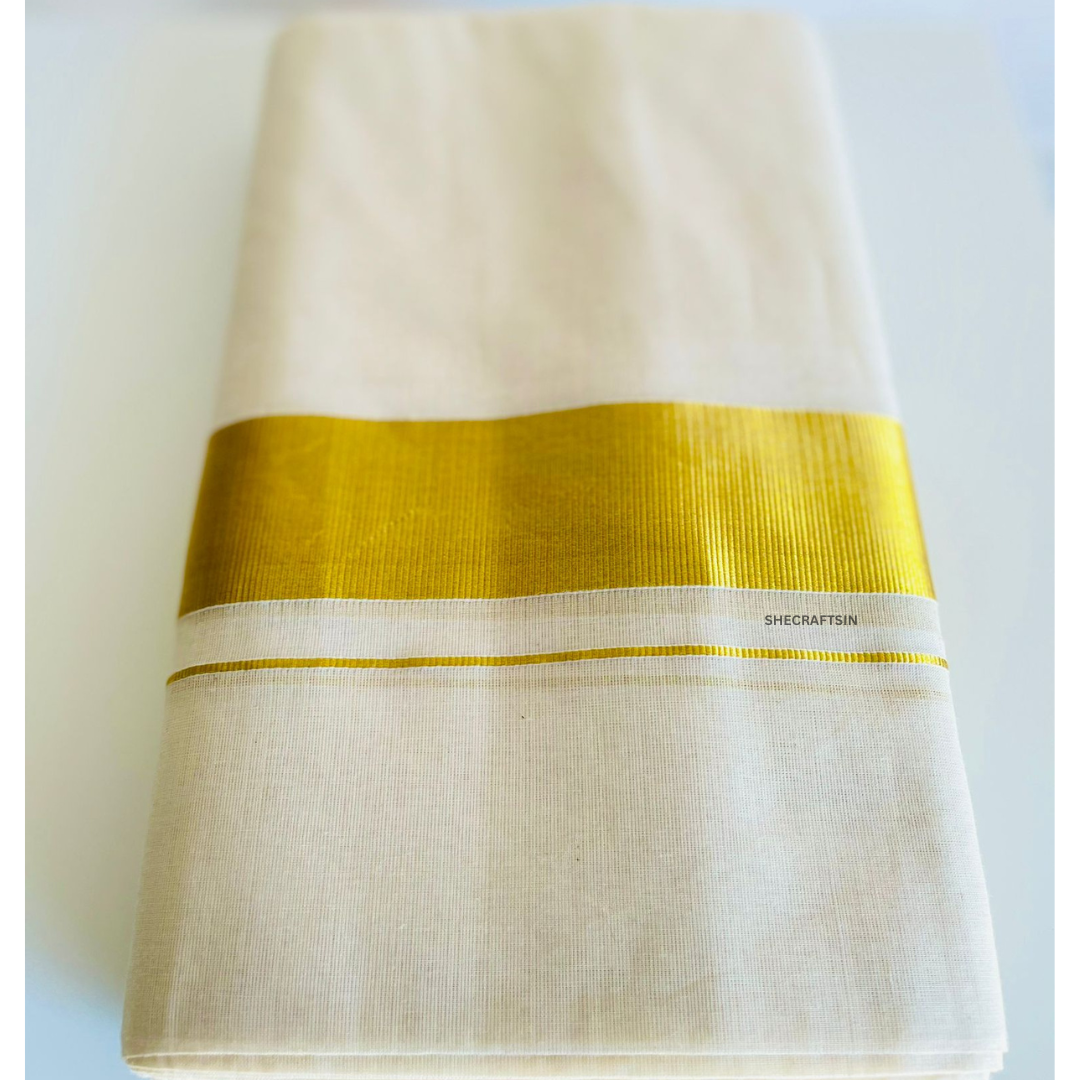 Kerala handloom dhoti, also known as Mundu, is a traditional garment worn by men in the Indian state of Kerala. It is a rectangular piece of fabric, usually made of cotton, that is worn around the waist and extends to cover the legs. The Mundu is typically white or off-white in color with a simple and elegant design.