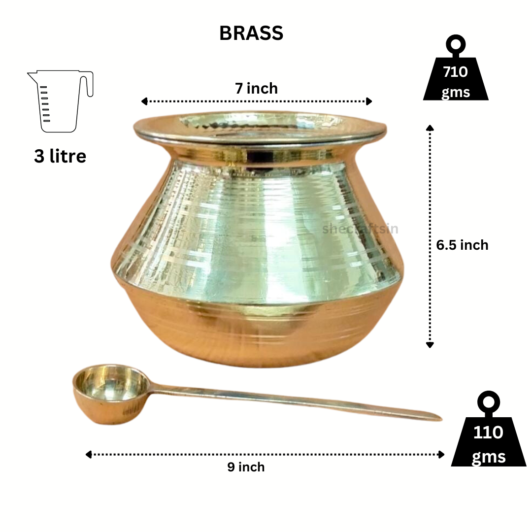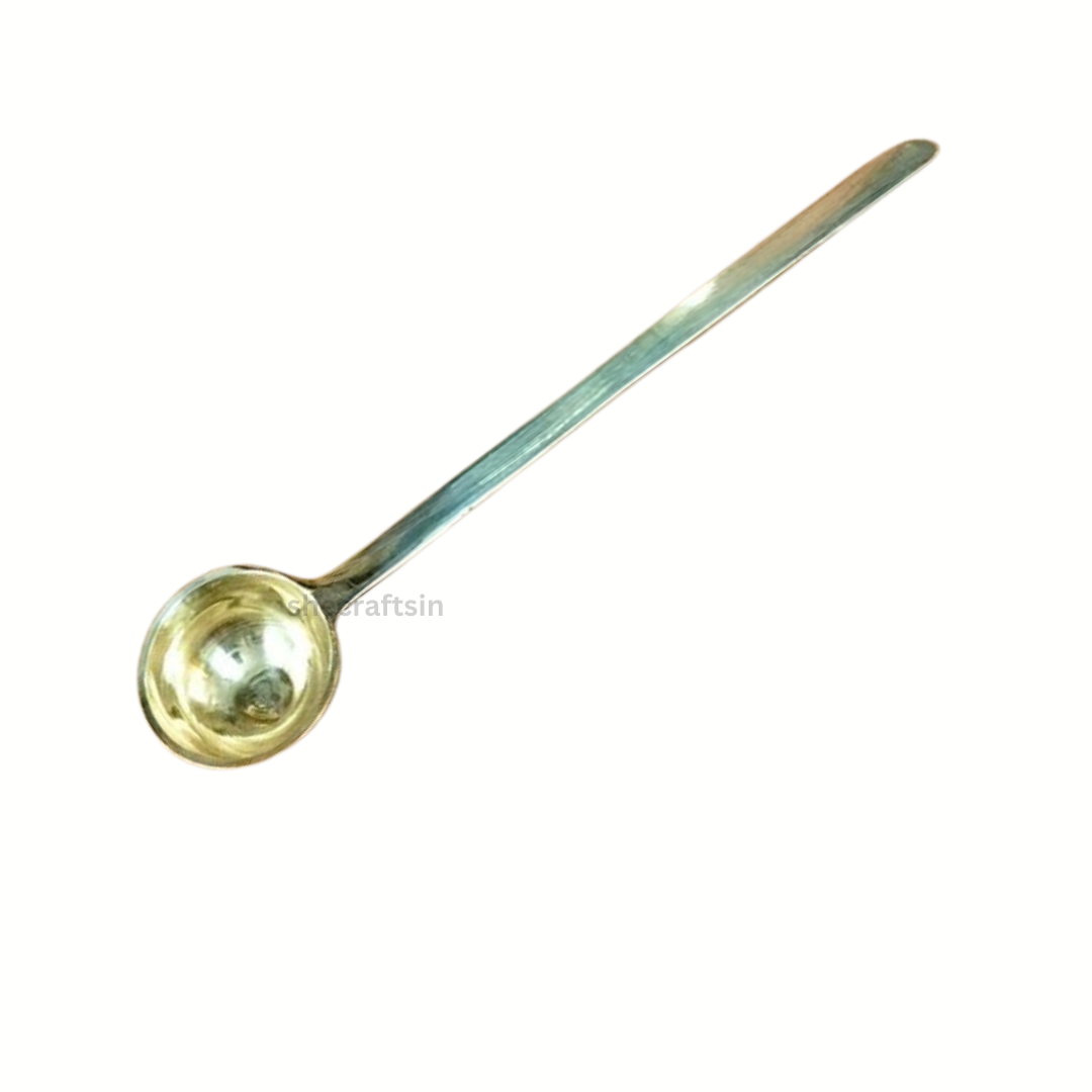4. Then, coat the interior with a thin layer of cooking oil and heat it gently for about 30 minutes. Allow the pot to cool, and wipe off any excess oil.                      A brass housewarming milk pot, also known as a brass milk boiling pot or brass milk canister, is a traditional Indian utensil used during housewarming ceremonies and other auspicious occasions. It is primarily used for boiling milk and preparing traditional Indian sweets or desserts. The milk pot is used specifically for boiling milk during housewarming ceremonies as it is considered an auspicious symbol of prosperity and abundance. It is also used for making traditional Indian sweets like payasam or kheer. Cooking: Brass pots with tin coating are suitable for various cooking methods, including boiling, simmering, sautéing, and stewing. They distribute heat evenly, helping to cook food uniformly. Cleaning: After cooking, allow the pot to cool down before cleaning it. Wash the pot with warm soapy water and a soft sponge or cloth. Avoid abrasive scrubbers or harsh cleaning agents that can damage the tin coating. Rinse thoroughly and dry the pot completely A brass karandi, also known as a brass ladle or brass skimmer, is a traditional Indian utensil used for various cooking and serving purposes. It is typically made of brass, known for its heat conductivity and durability.