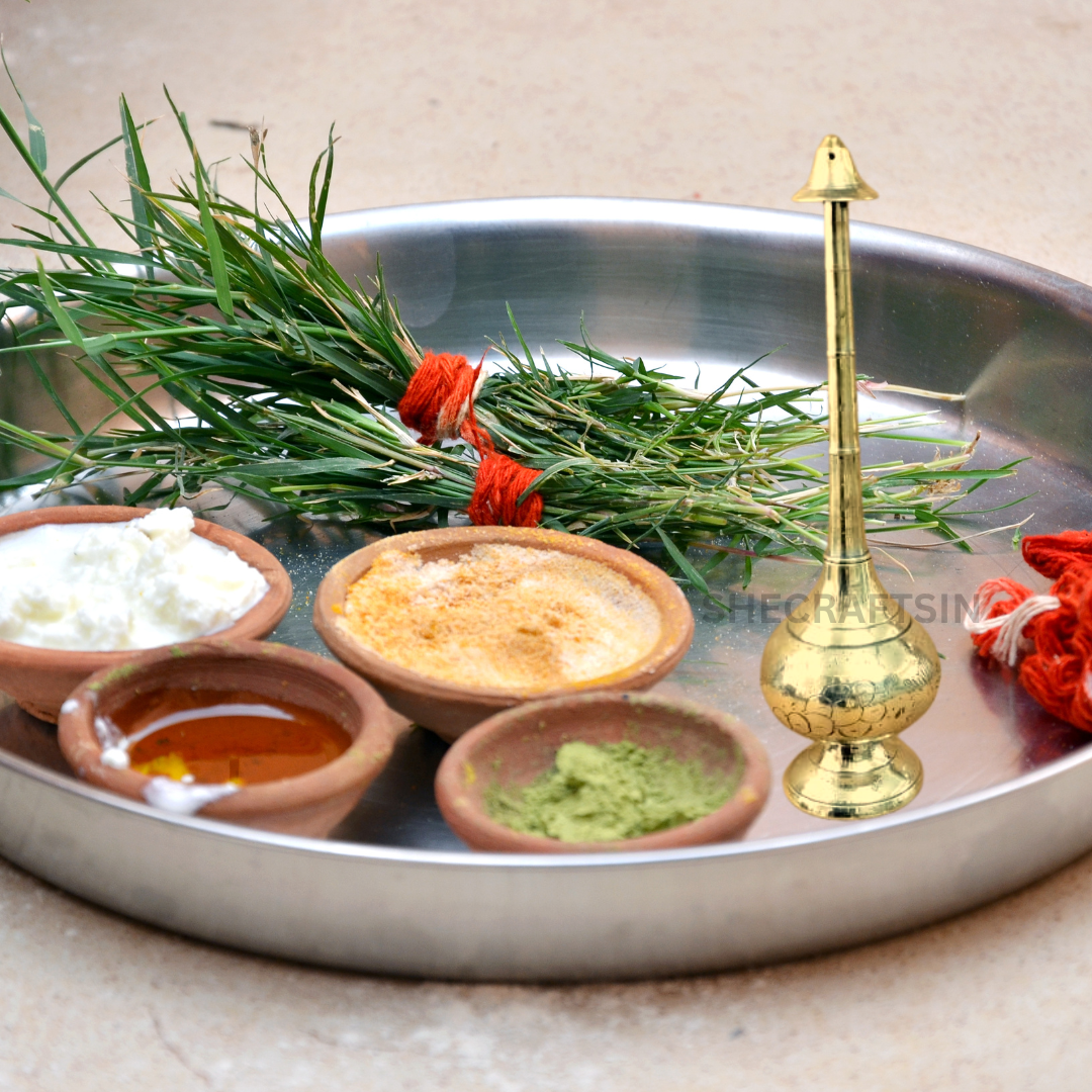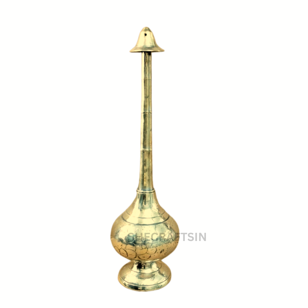 A brass rose water sprinkler is a ceremonial tool used in Hindu rituals, particularly during worship and religious ceremonies. It is also known as a "Pankha" or "Chamar" in Hindi. This ornate and decorative object is typically made of brass, but it can also be made of other metals such as copper or silver.
