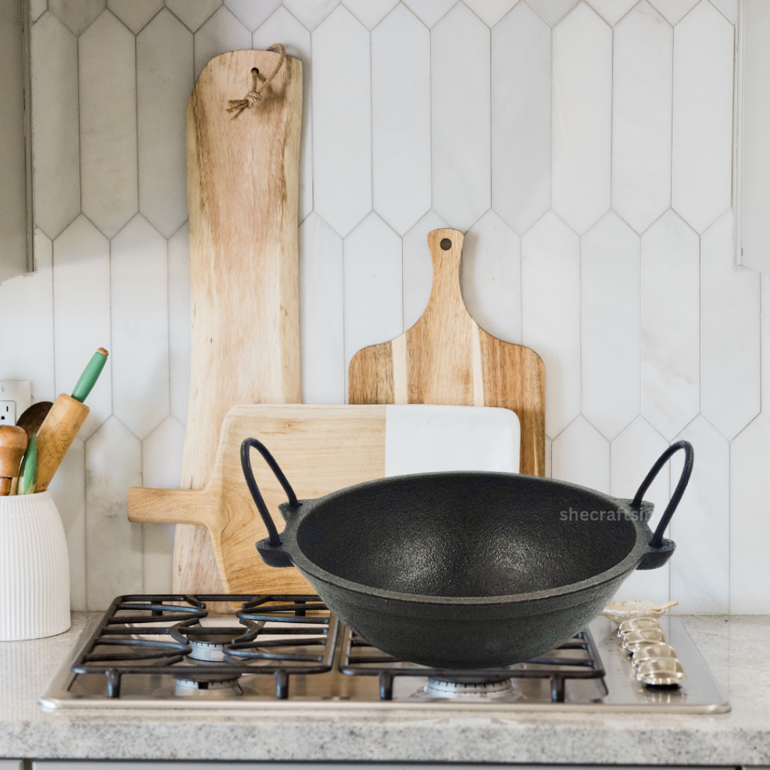 PRE- SEASONED CAST IRON KADAI WITH NEEM WOODEN LADLE