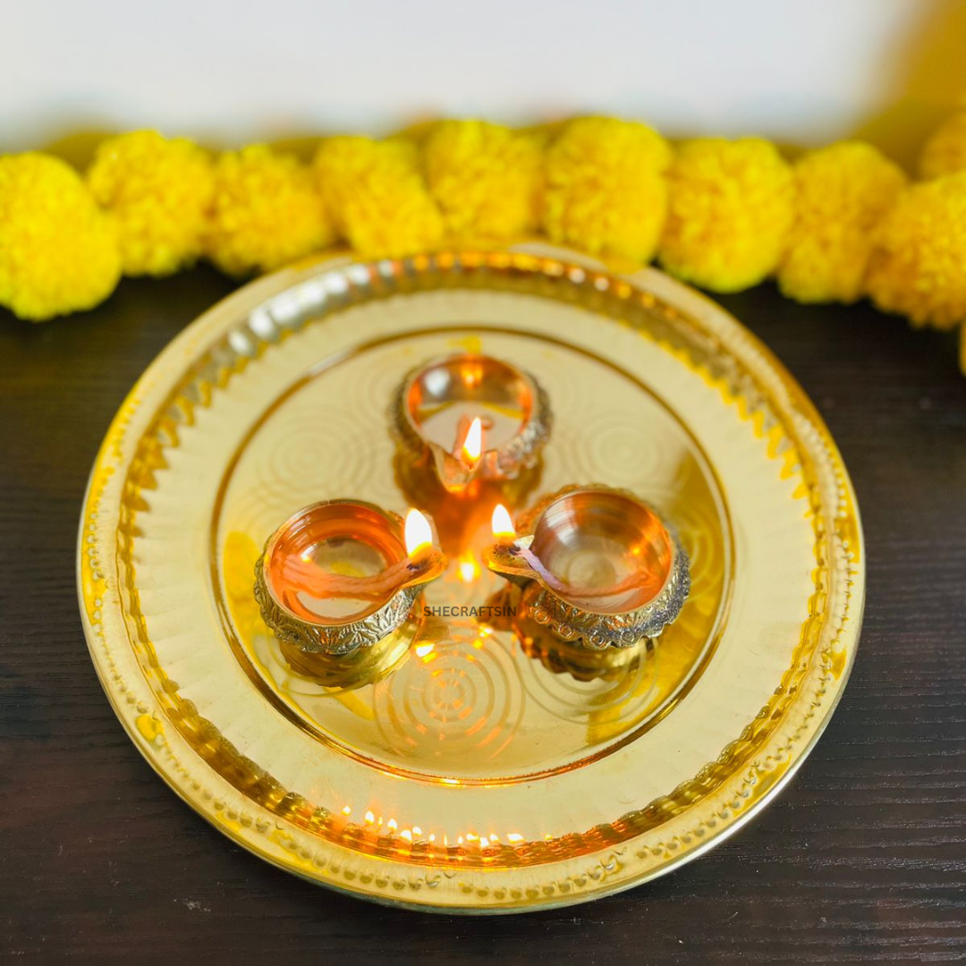 PURE BRASS SOLID THALIKA WITH 3 KUBERA LAMP | THALAM | BRASS POOJA SAMAGRI | POOJA ARATHI | DIWALI DIYA | POOJA ARATHI PLATE