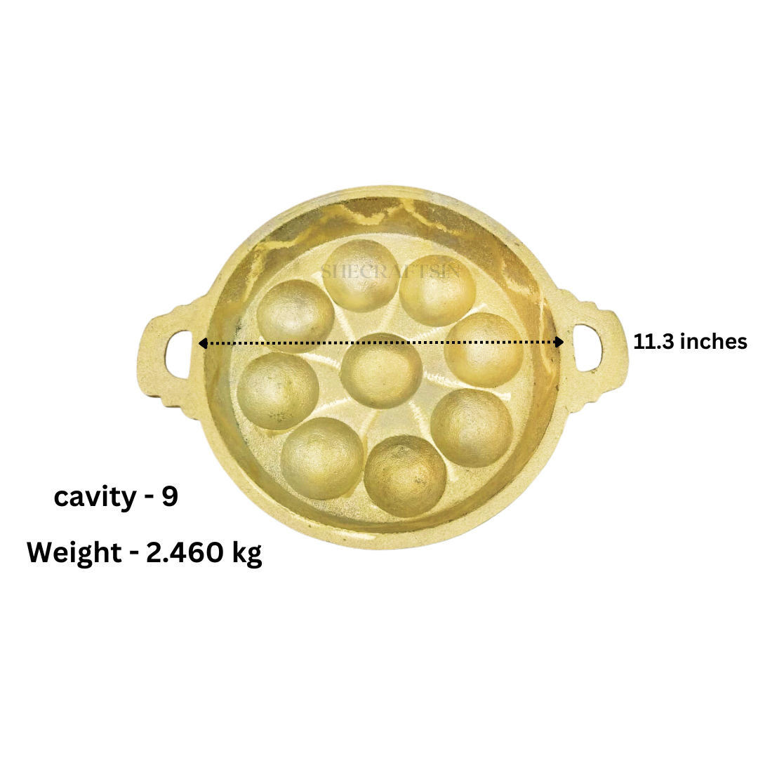 A handmade bronze unniyappam maker with 9 cavities is a traditional kitchen utensil used to prepare unniyappam, a popular South Indian snack. Unniyappams are round, sweet, and fried treats made from a batter of rice flour, jaggery, bananas, and coconut. The handmade bronze unniyappam maker adds a touch of tradition and authenticity to the cooking process. Here's more about its significance and usage: