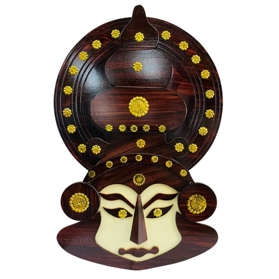 A traditional wooden Kerala Kathakali face wall hanging is a decorative piece of art inspired by the vibrant and elaborate art form of Kathakali, which originates from the Indian state of Kerala. Kathakali is a classical dance-drama that combines dance, music, and acting, often characterized by its colorful and intricately designed costumes, makeup, and facial expressions.